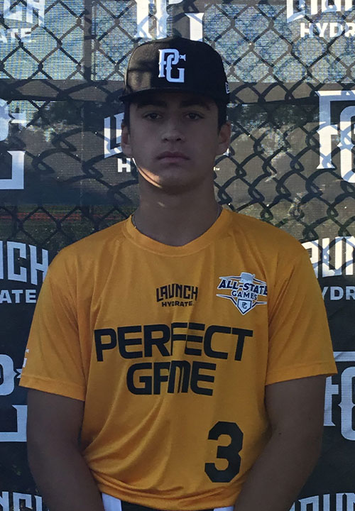 Christos Dimitrakakis is a 2027 RHP/3B/MIF with a 6-2 185 lb. frame from Glen Head, NY who attends Chaminade. Big and strong build with plenty of projection remaining. Works from a full wind up and a well timed high 3/4's arm action, repeated his mechanics well. Fastball was in the mid-80's and topped out at 87 mph, mostly straight. Curveball had some spin and 11/5 shape/bite with developing feel for his release point. Still learning how to pitch and use his arm talent. Right handed hitter, sets up in a narrow stance with a hanging leg raise trigger, has a strong and well balanced swing with good bat speed and some lift out front, hit the ball hard to the middle of the field and opposite field. 7.46 runner in the sixty. Secondary third baseman on defense, has a good first step to the ball and fields cleanly, throws from a lower 3/4's arm slot with some carry, adjusted his arm slots well. Some potential as a two-way player. Good student. Named to the PG Northeast High School All-State Games Top Prospect List.